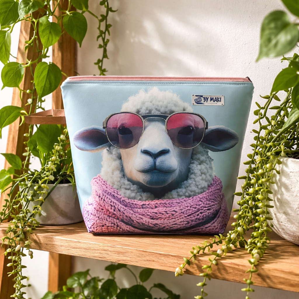 Projekt taske med får på forsiden og pudder lærred på bagsiden .